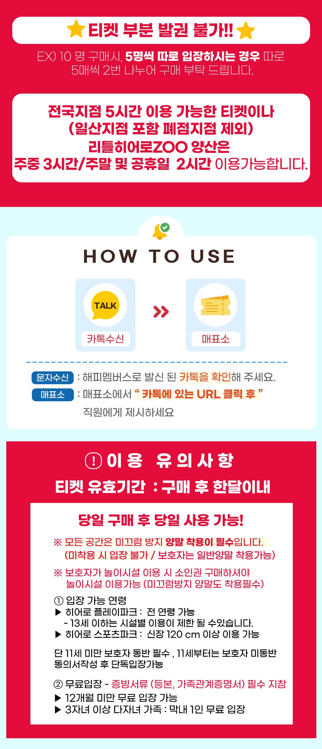 - 부분 사용이 불가한 티켓으로 구매시 이용하는 수량만큼 나누어 구매 부탁드립니다.